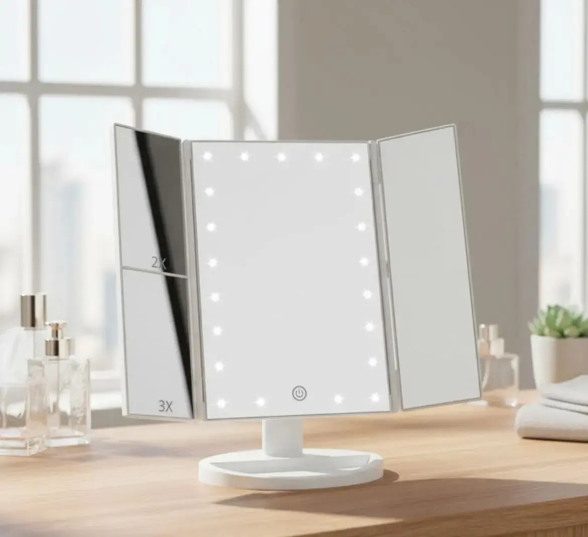 Iluminá tu rutina diaria con este espejo LED de tres paneles, pensado para verte con claridad desde todos los ángulos. Imagen nítida, aumento para detalles y diseño plegable, ideal para maquillarte y cuidarte con comodidad todos los días.